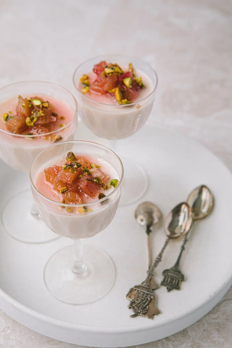 I topped these possets with poached rhubarb and chopped pistachios.